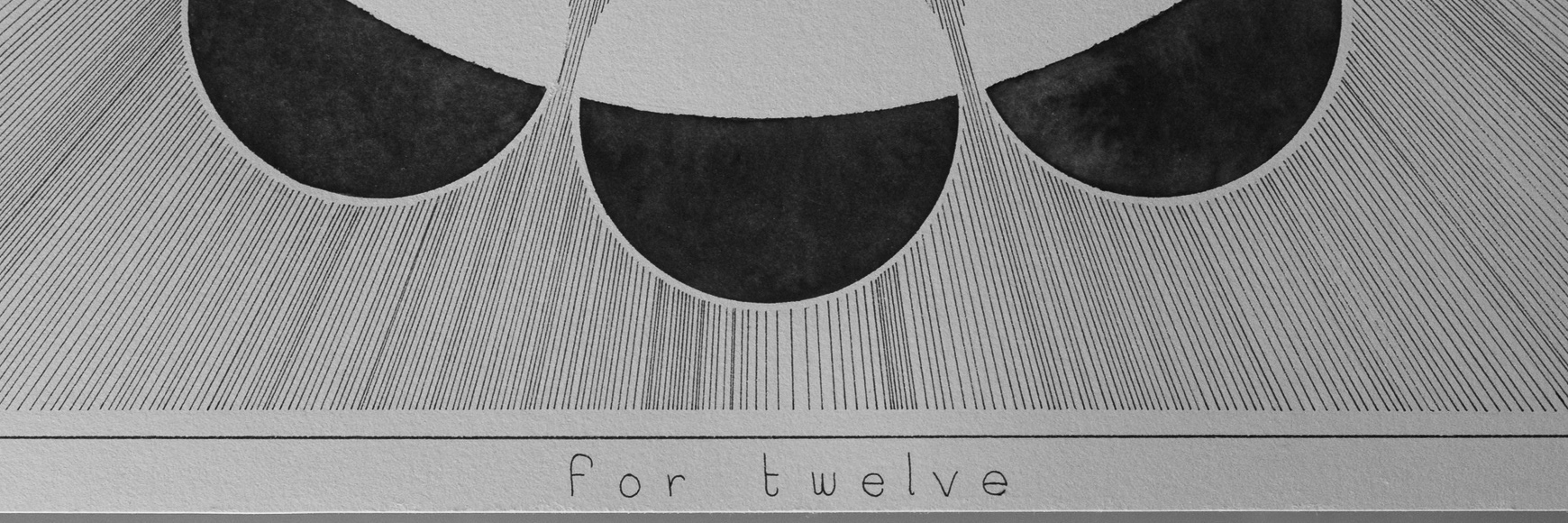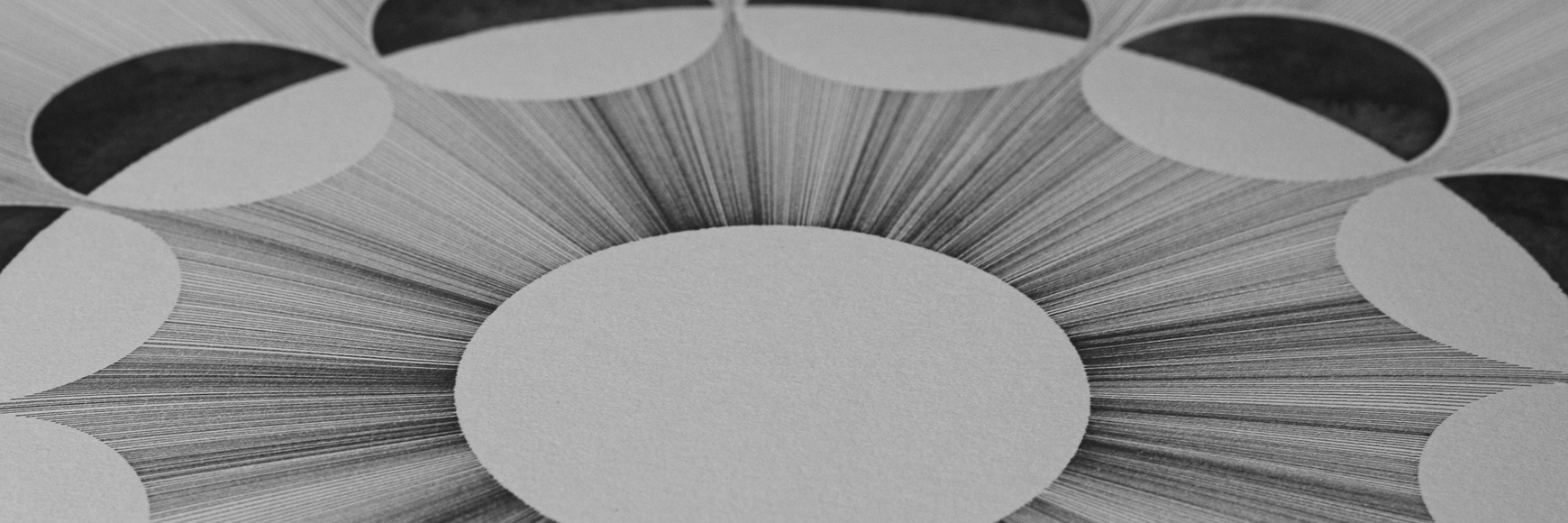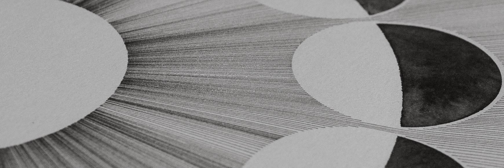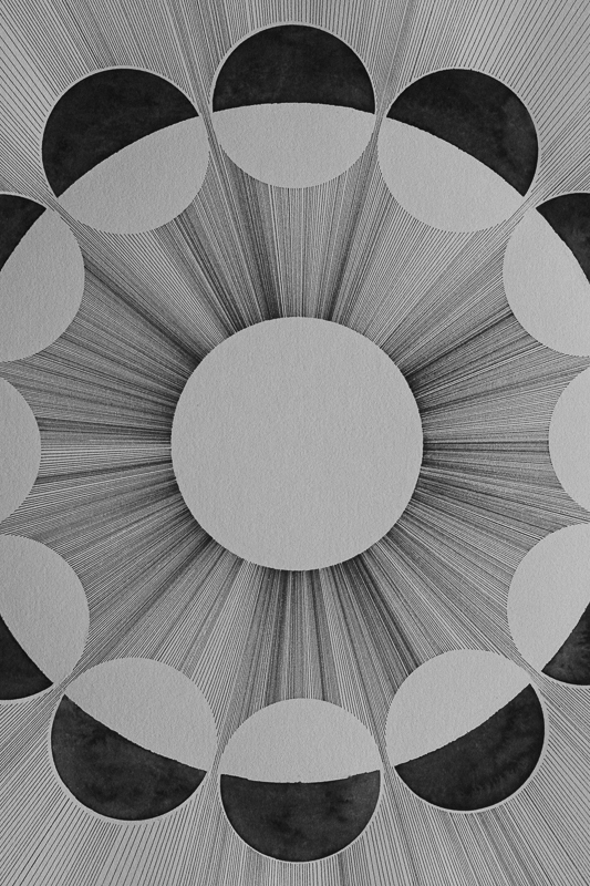 Hand-drawn radial lines extend from the edge of the sun, the light and shadow fall on the outer ring. An experiment with grey paper and watercolor inks